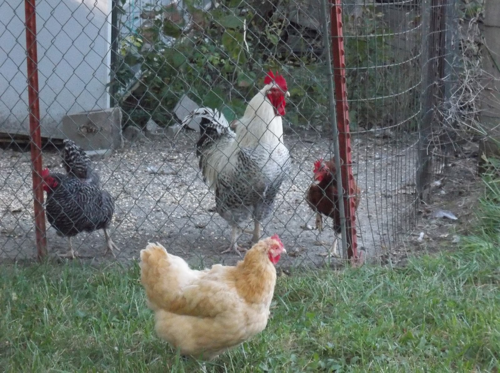 My experiment with letting the rooster and two other hens out for greens was not so successful. Looking out, I saw he was leading them on what amounted to a cross-country trip for chickens. I had to lure them back at dusk with a trail of bread crumbs.
